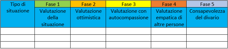 Utilizzando la seguente tabella, partite da una determinata situazione e scrivete le vostre sensazioni al riguardo, per poi passate alla valutazione ottimistica, ovvero sviluppare un significato più positivo della vostra valutazione iniziale.